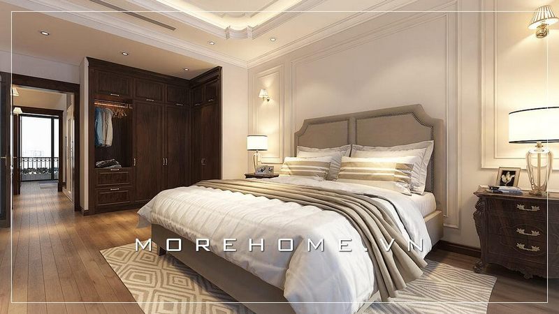 Tủ quần áo biệt thự được làm từ chất liệu gỗ óc chó nhập khẩu, gam màu nâu nhã nhặn và trầm ấm tạo sự cuốn hút cho cả căn phòng